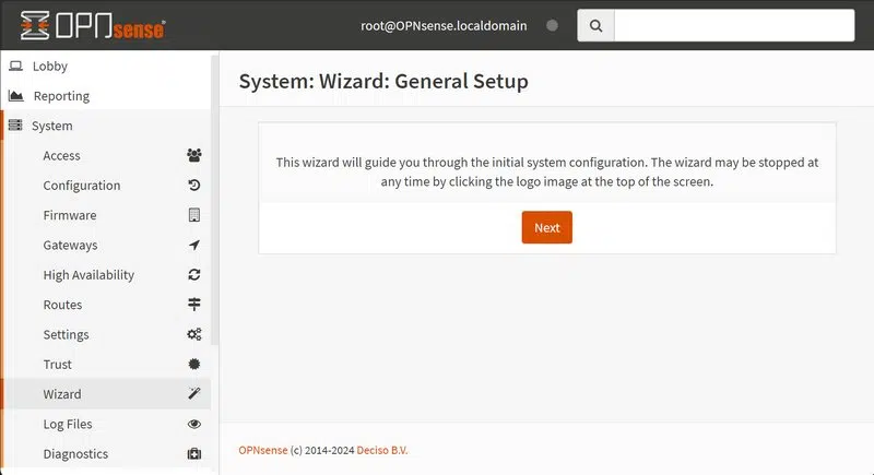 Patientez quelques secondes... Vous serez invité à suivre un assistant pour effectuer la configuration de base du firewall. Cliquez sur "Next" pour continuer.