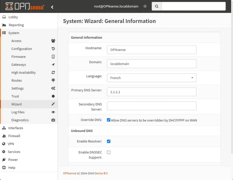 La première étape consiste à définir le nom d'hôte, le nom de domaine, à choisir la langue et à définir aussi le(s) serveur(s) DNS à utiliser pour la résolution de noms. Le fait de conserver l'option "Enable Resolver" permettra d'utiliser le firewall en tant que résolveur DNS, ce qui sera utile pour les machines de notre LAN virtuel.