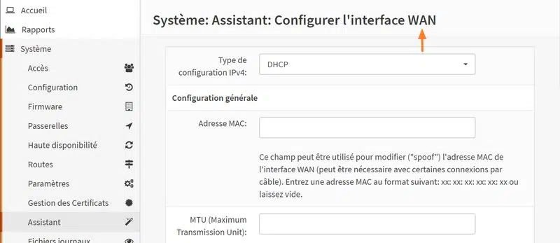 Ensuite, vient une étape importante : la configuration de l'interface WAN. Actuellement, elle est configurée en DHCP et elle va rester dans ce mode de configuration, sauf si vous souhaitez définir une adresse IP statique.