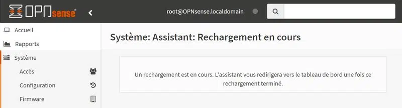 Poursuivez jusqu'à la fin afin d'enclencher le rechargement de la configuration. Vous devez retourner sur le terminal d'OPNsense afin de réexécuter la commande pour désactiver le pare-feu, sinon, vous n'aurez plus la main depuis le WAN.