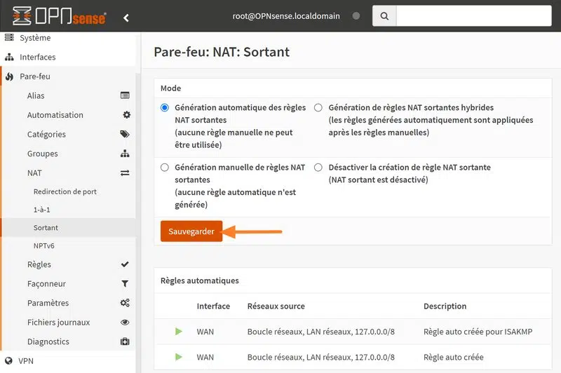 Après s'être connecté à OPNsense, partons à la découverte de la configuration du NAT. Accédez à cet endroit : Pare-feu > NAT > Sortant. Ici, vous avez le choix entre la création de règles de NAT sortantes automatiques (mode par défaut) ou la création manuelle.