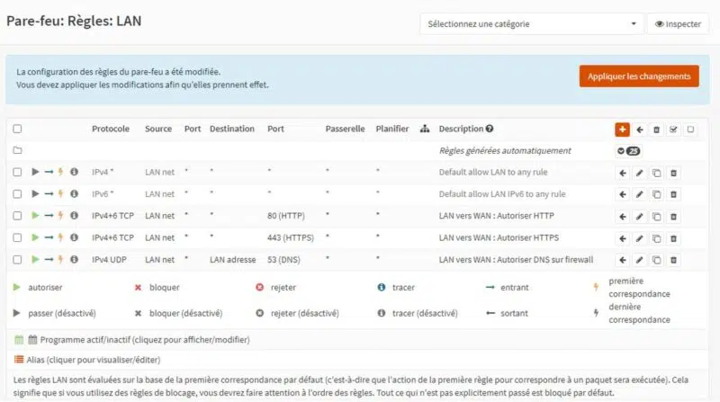 Il ne reste plus qu'à cliquer sur "Appliquer les changements" pour basculer en production les nouvelles règles de pare-feu. Sachez que tous les flux qui ne sont explicitement autorisés seront bloqués par défaut.