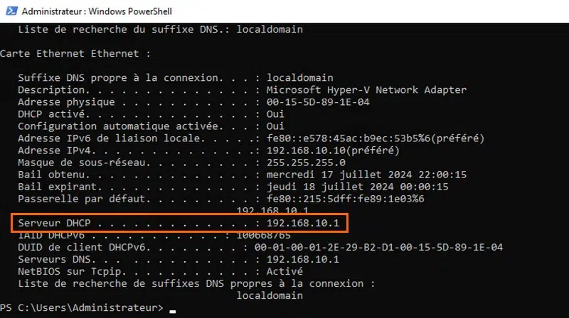 L'interface WAN, qui nous permettra de simuler l'évasion vers internet, sera rattachée à un commutateur virtuel "Externe". Cette interface WAN se verra attribuer une configuration IP (adresse IP, masque de sous-réseau, passerelle et serveur DNS) par le serveur DHCP présent sur le réseau local auquel est connecté l'Hyper-V (votre box opérateur, par exemple).