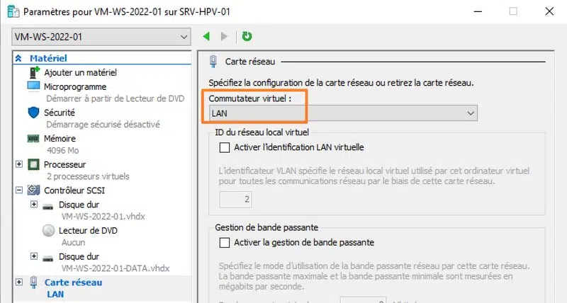 Cette seconde carte réseau doit être affectée au commutateur virtuel "LAN", comme le montre l'image ci-dessous.