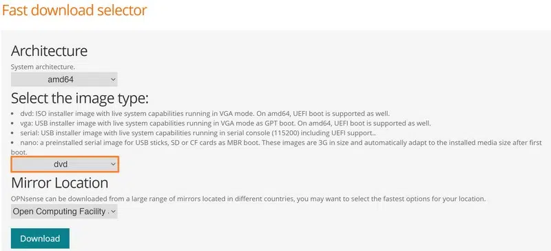 - L'image ISO d'installation de OPNsense à télécharger depuis le site officiel (sélectionnez "DVD" comme type d'image pour obtenir une image ISO).