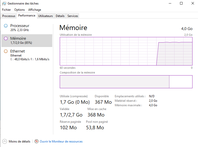Hyper-V va pouvoir lui affecter de la RAM car la VM a le droit à 4 Go de RAM maximum, mais également parce que l'hôte physique a encore de la RAM disponible. L'image ci-dessous montre bien que la RAM est passée à 2 Go et que la VM en consomme 1,7 Go.