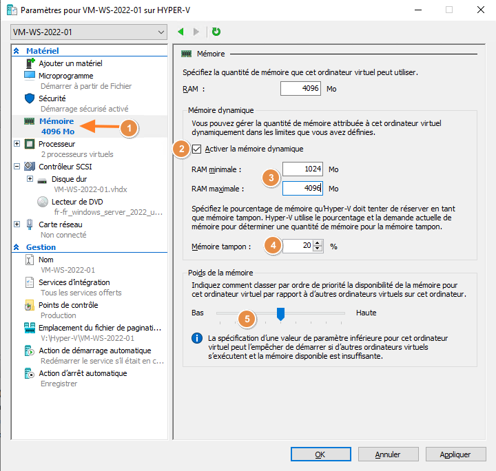 Dans cet exemple, la machine virtuelle "VM-WS-2022-01" va bénéficier d'une RAM minimale de 1 Go et une RAM maximale de 4 Go. Donc, si la demande en mémoire augmente dans la VM, Hyper-V pourra lui allouer jusqu'à 4 Go, et si la demande diminue, Hyper-V va réduire l'allocation de mémoire de façon dynamique.