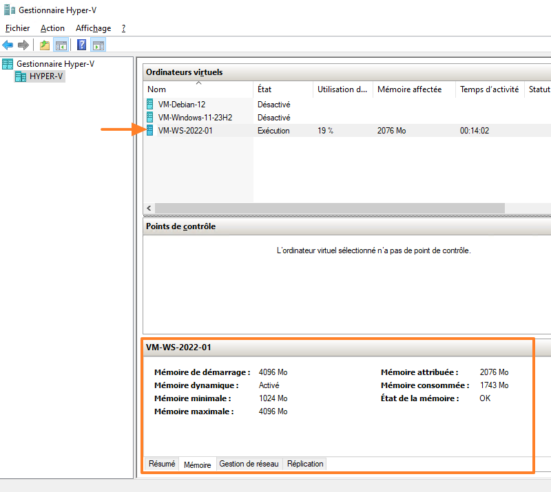 Du côté du "Gestionnaire Hyper-V", en cliquant sur cette VM, nous pouvons voir des statistiques sur la RAM dynamique. Parfois, il peut y avoir un écart entre les données dans la VM et celles présentées dans la console Hyper-V, notamment lorsque l'hyperviseur décide de diminuer la RAM allouée à une VM.