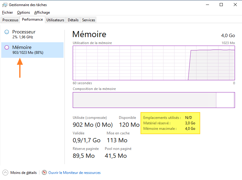 Nous allons lancer la machine virtuelle pour voir comment elle se comporte vis-à-vis de la RAM dynamique. Dans la VM, si nous consultons le "Gestionnaire des tâches", nous pouvons voir que la VM croit qu'elle dispose de 1 Go de RAM (1023 Mo, pour être précis). Néanmoins, il est bien précisé qu'elle peut disposer de 4 Go de RAM au maximum.