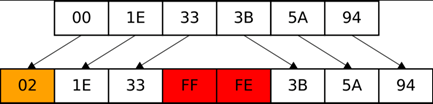 Les adresses EUI-64 sont construites à partir de l’adresse MAC-48 en insérant FFFE dans les octets 4 et 5 de l’adresse considérée :