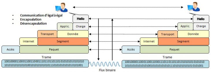 Au final, si l’on prend l’exemple d’une transmission d’un paquet depuis un client, à destination d’un serveur, on peut représenter le flux binaire et d’encapsulation de la façon suivante :