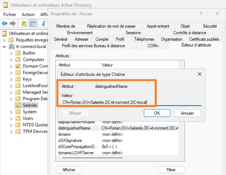 - CN=Florian,OU=Salariés,DC=it-connect,DC=local