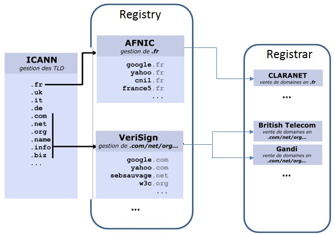 En-dessous, l’ICANN délègue son administration et la gestion de ces TLD à un autre organisme appelé registry. Ceux-ci ont un rôle purement technique et chacun d’eux doit tenir à jour la liste des domaines définis sur son périmètre (c’est-à-dire son ou ses TLD respectifs). Parmi les registry connus, on peut citer l’AFNIC pour la gestion du registre des domaines .fr et VeriSign qui s’occupe plus des domaines .com, .net ou .biz.