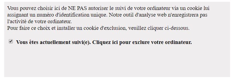 Au sein de votre politique de confidentialité, généralement sur une page dédiée, vous devez intégrer un code Matomo qui indique à l’utilisateur s’il est actuellement suivi ou non par l’outil. Cette intégration doit aussi permettre à l’utilisateur de cliquer pour ne plus être suivi.