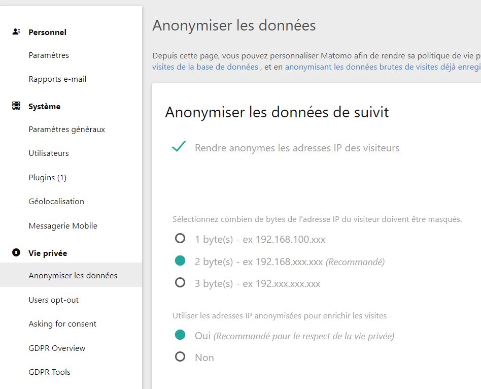 Conformément aux obligations de la CNIL et afin de respecter le RGPD, vous devez anonymiser les adresses IP récoltées dans Matomo. Fort heureusement, l’application intègre nativement cette option contrairement à Google Analytics.