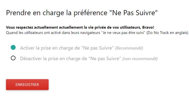 Pour montrer votre engagement vis-à-vis du respect de la vie privée de vos visiteurs, vous pouvez activer la prise en charge de « Do Not Track » dans : Paramètres > Vie privée > Users opt-out.