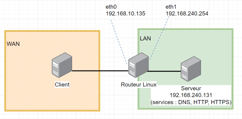 - Un serveur Linux faisant office de routeur qui séparera le LAN du WAN. Il disposera donc de deux interfaces ainsi que de nftables pour effectuer du NAT source unidirectionnel et diverses opérations de filtrage.