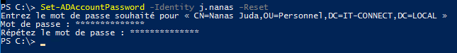 En fait, le fait d’indiquer -Reset permet de réinitialiser le mot de passe, c’est-à-dire qu’on le change sans connaître le mot de passe actuel, car les droits le permettent.