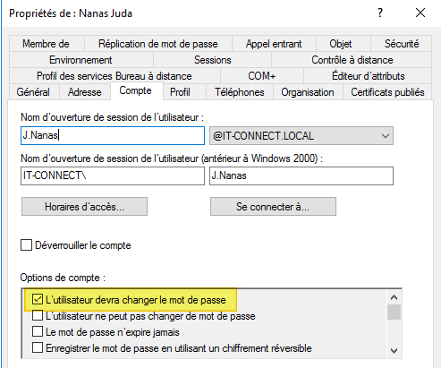 Cela nécessite une action supplémentaire afin d’activer l’option « L’utilisateur devra changer le mot de passe » dans les propriétés de l’objet de cet utilisateur.