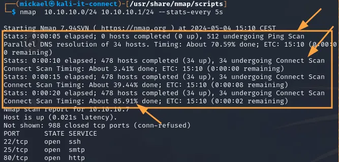 Enfin, pour avoir uniquement un suivi basique et synthétique de l’avancée du scan Nmap, nous pouvons utiliser l’option “--stats-every 5s”, le “5s” signifie ici 5 secondes et peut être modifié en fonction de vos besoins. Il s’agit de la fréquence à laquelle nous aurons un retour de Nmap sur son avancement :