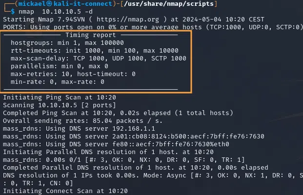 Enfin, Nmap dispose également de deux options de debug qui sont “-d” et “-dd”. Ces options ont un comportement similaire à l’option de verbosité “-v”, mais ajoutent des informations techniques supplémentaires, comme une synthèse des paramètres techniques en début de scan :