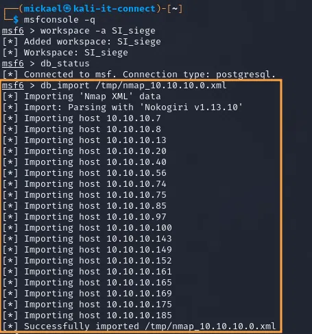 Enfin, nous pouvons utiliser la commande Metasploit “db_import” pour importer notre scan Nmap au format XML :