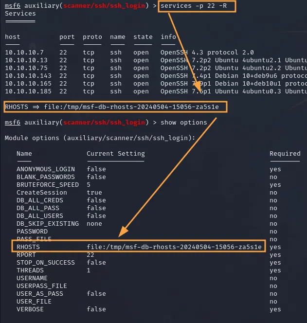 Enfin, nous pouvons très facilement et rapidement réutiliser ces données dans un module grâce à l’option “-R”, qui va “convertir” la liste des services obtenue en entrée pour la directive “RHOSTS”, qui permet justement de spécifier les cibles de l’attaque à mener. Voici un exemple avec le module “ssh_login” qui permet d’effectuer une attaque par brute force sur les serrvices SSH :