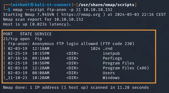 Ainsi, Nmap aurait également exécuté ce test de connexion anonyme s’il avait trouvé un service FTP sur un autre port.