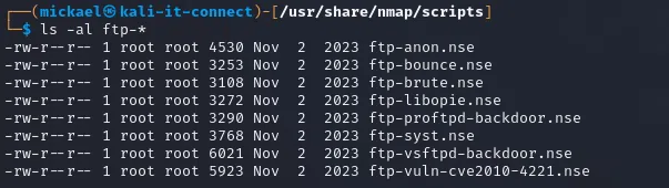 Ce répertoire contient plus de 5 000 scripts NSE. Dans la majorité des cas, la première partie du nom de script contient le protocole ou la catégorie à laquelle il se rattache. Cela nous permet de faire un tri, par exemple si l’on souhaite lister tous les scripts qui visent le service FTP :