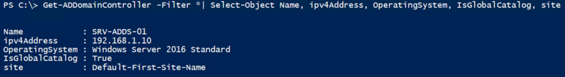 Get-ADDomainController -Filter *| Select-Object Name, ipv4Address, OperatingSystem, IsGlobalCatalog, site