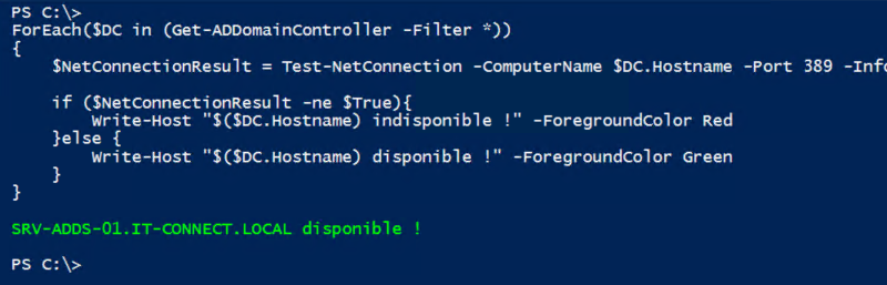 Ci-dessous, le bout de code qui permettra de vérifier la disponibilité des contrôleurs de domaine :