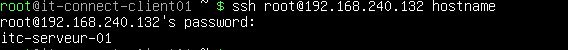 Depuis notre client Linux, en ligne de commande, nous allons vouloir invoquer la commande "hostname" sur notre serveur :