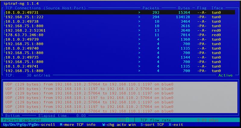 Enfin, si l’on préfère utiliser un outil un peu plus graphique, il est possible d’utiliser l’interface de iptraf-ng qui présente les différentes interfaces en corrélation avec leurs entrées/sorties pour chacune d’elles :