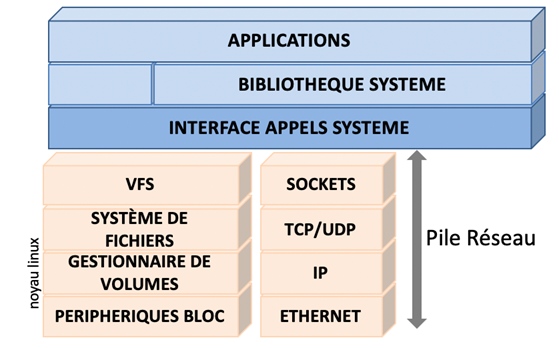 Pour ce niveau nous avons là aussi différentes strates successives. Il faut en effet, gérer les sockets, la couche Réseau (via le protocole IP) la couche Transport (via l’un des protocoles TCP ou UDP) et enfin, la couche Ethernet. Cela peut se schématiser de la façon suivante :