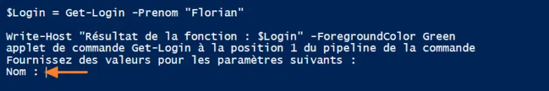 Désormais, si nous appelons la fonction sans préciser le prénom ou le nom, PowerShell restera en attente d'une valeur.