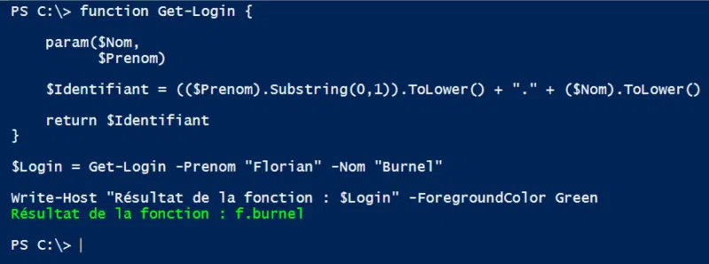 Cette fonction PowerShell retourne bien le résultat attendu puisqu'avec le prénom "Florian" et le nom "Burnel", nous obtenons l'identifiant "f.burnel.