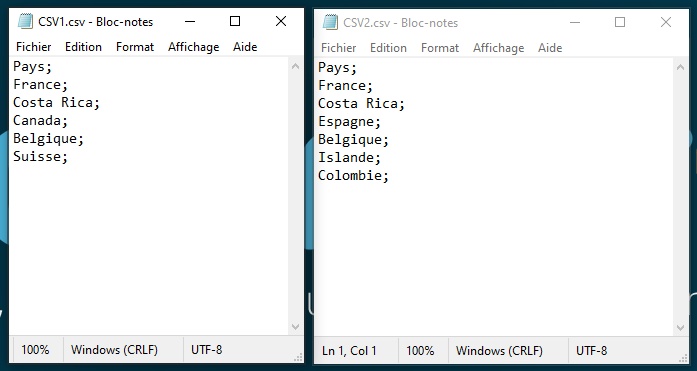 Chaque fichier CSV contient une seule colonne nommée "Pays", mais nous pourrions avoir plusieurs colonnes. Nous allons comparer ces deux fichiers pour identifier facilement les différences.
