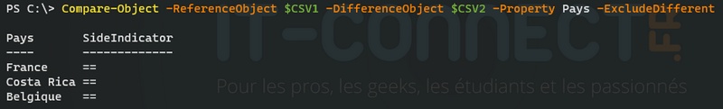 Ensuite, nous allons comparer la variable "$CSV1" et la variable "$CSV2". Le fichier CSV1 sera notre objet de référence, nous allons l'associer au paramètre "-ReferenceObject" alors que l'objet de "différence" sera le fichier CSV2. Il faut également spécifier la propriété sur laquelle se baser pour faire la comparaison, ici, ce sera notre colonne "Pays".
