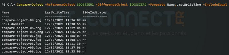 Dans le cas où les chaînes seraient égales, la commande ne va rien retourner. Si l'on veut inclure les éléments égaux, il faut ajouter le paramètre "-IncludeEqual".