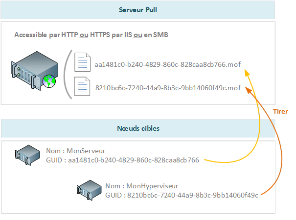 A l’inverse du mode push où l’on pousse les configurations, en mode pull ce sont les nœuds qui viennent chercher (tirer) les configurations sur un serveur pull. Ce serveur pull peut publier les configurations via un partage SMB, via IIS en HTTP ou via IIS en HTTPS.