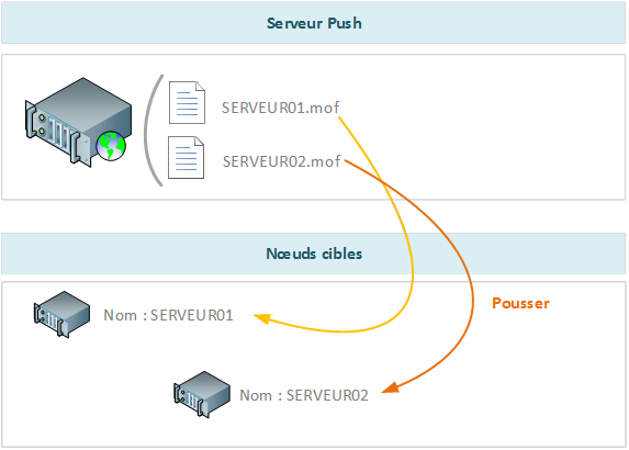 En mode push, vous devez pousser aussi les modules PowerShell sur les nœuds cibles pour qu’ils soient accessibles en local lorsque vous exécuterez la configuration. En mode pull, vous n’avez pas à vous soucier de cette partie, les ressources et modules seront automatiquement récupérées si besoin.