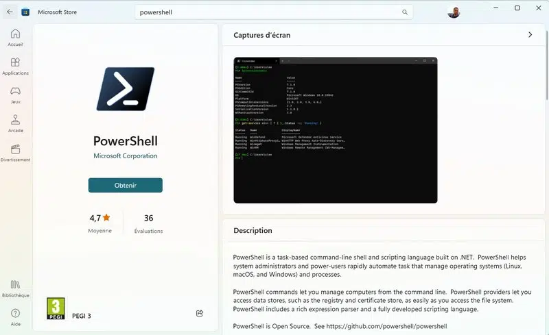À partir du Microsoft Store, il vous suffit de rechercher "powershell" afin de le trouver dans la liste des applications disponibles. Ensuite, cliquez sur le bouton "Obtenir".