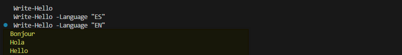 Nous allons faire évoluer notre exemple précédent. Nous pourrions ajouter le paramètre "-Language" permettant de préciser la langue (sur deux lettres) dans laquelle nous souhaitons dire bonjour. Ensuite, dans la fonction, nous devrons analyser la valeur associée à ce paramètre pour retourner bonjour dans la langue sélectionnée. Nous ferons en sorte que, par défaut, la langue soit le français.
