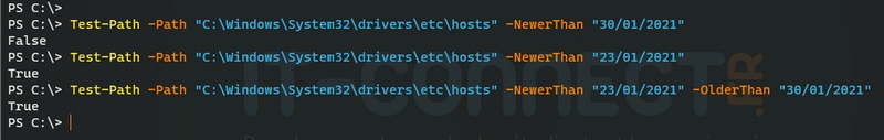 Test-Path -Path "C:\Windows\System32\drivers\etc\hosts" -NewerThan "01/01/2024" -OlderThan "30/04/2024"