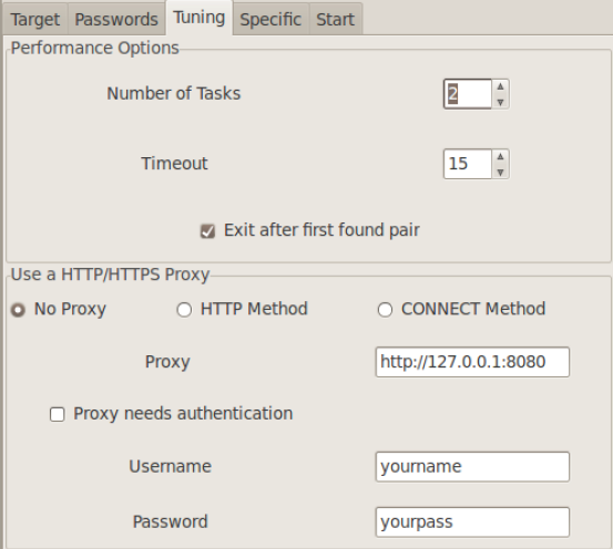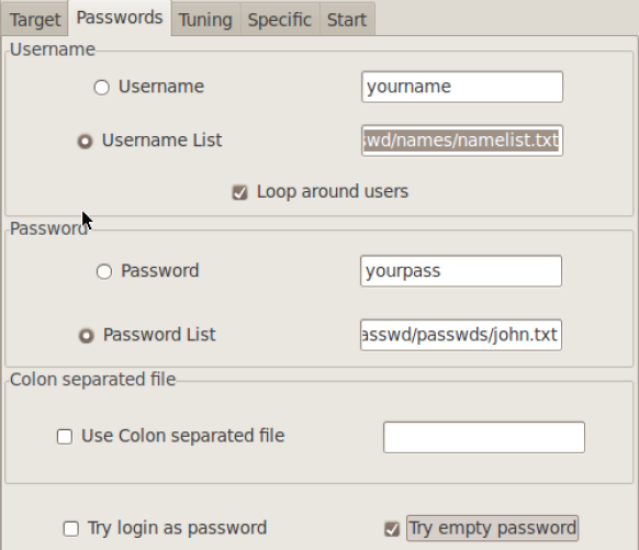 Au niveau de l’onglet ‘Passwords’ on peut ensuite préciser le fichier des comptes utilisateurs concernés (via la liste Username List) ainsi que la liste des mots de passe associés: