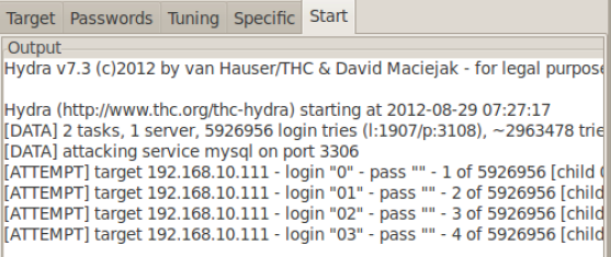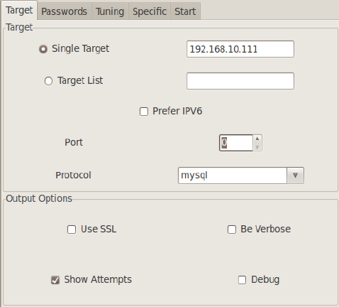 Il ne reste plus qu’à ouvrir l’onglet ‘Target’ afin de fixer la cible et le protocole attendu pour ce type d’attaque. Pour l’exemple, nous choisissons une machine MySQL/MariaDB possédant l’adresse IP 192.168.10.111 :