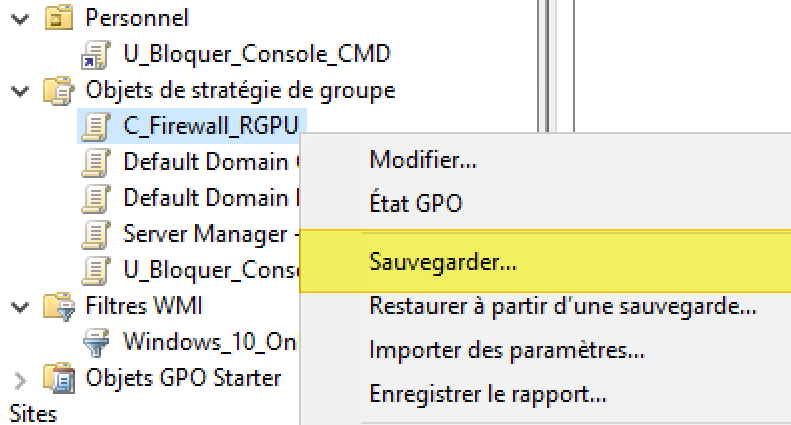 Si, par exemple, on souhaite sauvegarder la GPO "C_Firewall_RGPU" que l'on a créé dans un précédent chapitre, il suffit de faire un clic droit dessus et de cliquer sur "Sauvegarder...".