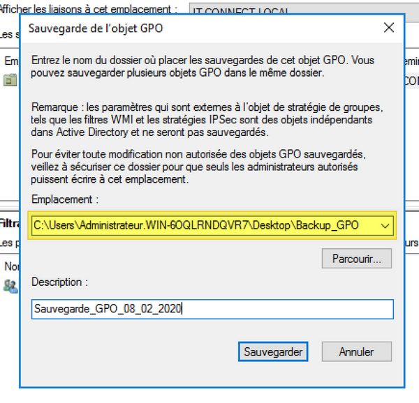 - La description, par exemple le nom de la GPO ou la date de sauvegarde