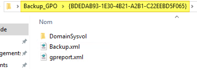 Ensuite, si l'on regarde au niveau du stockage ce que ça donne, on remarque bien la présence d'un nouveau dossier correspondant à la sauvegarde notre GPO. A l'intérieur, on retrouve les différents fichiers de notre GPO.
