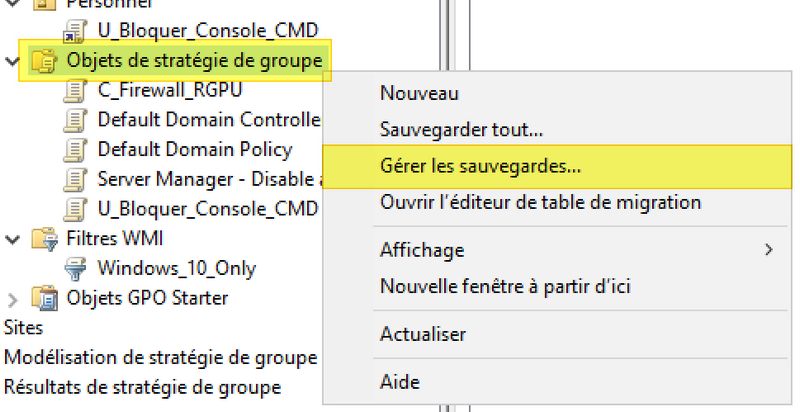 Maintenant, intéressons-nous à la restauration d'une GPO à partir d'une sauvegarde. Toujours dans la console GPMC, cette fois-ci, effectuez un clic droit directement sur "Objets de stratégie de groupe" puis cliquez sur "Gérer les sauvegardes".